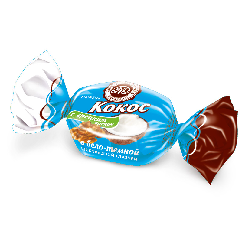 Кокос в бело-темной шоколадной глазури с грецким орехом
